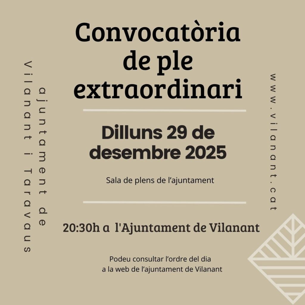 L’Ajuntament de Vilanant convoca una sessió plenària extraordinària dilluns 29 de desembre de 2025. A les 20.30 hores a la sala de Plens de l’Ajuntament de Vilanant i Taravaus.